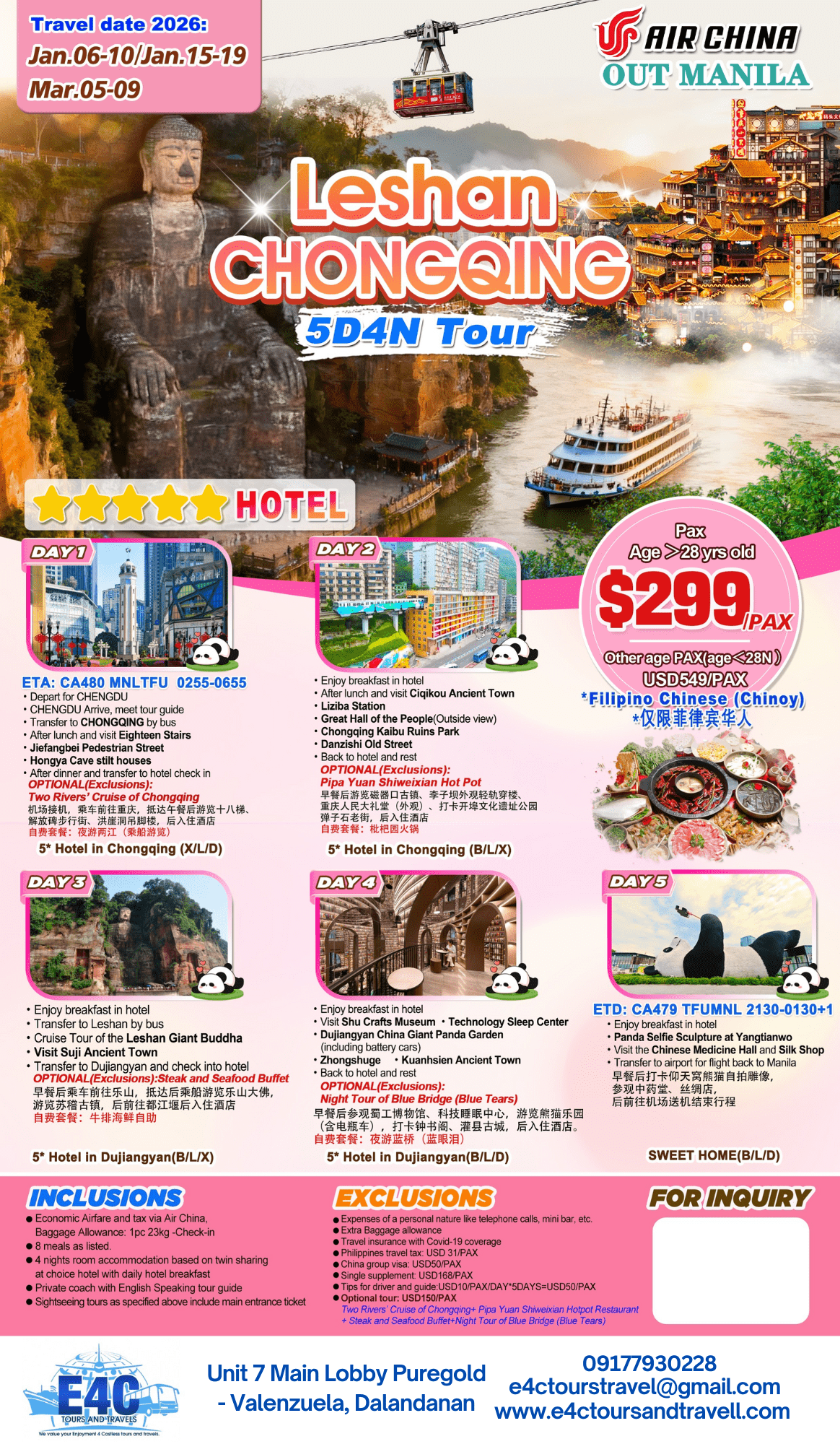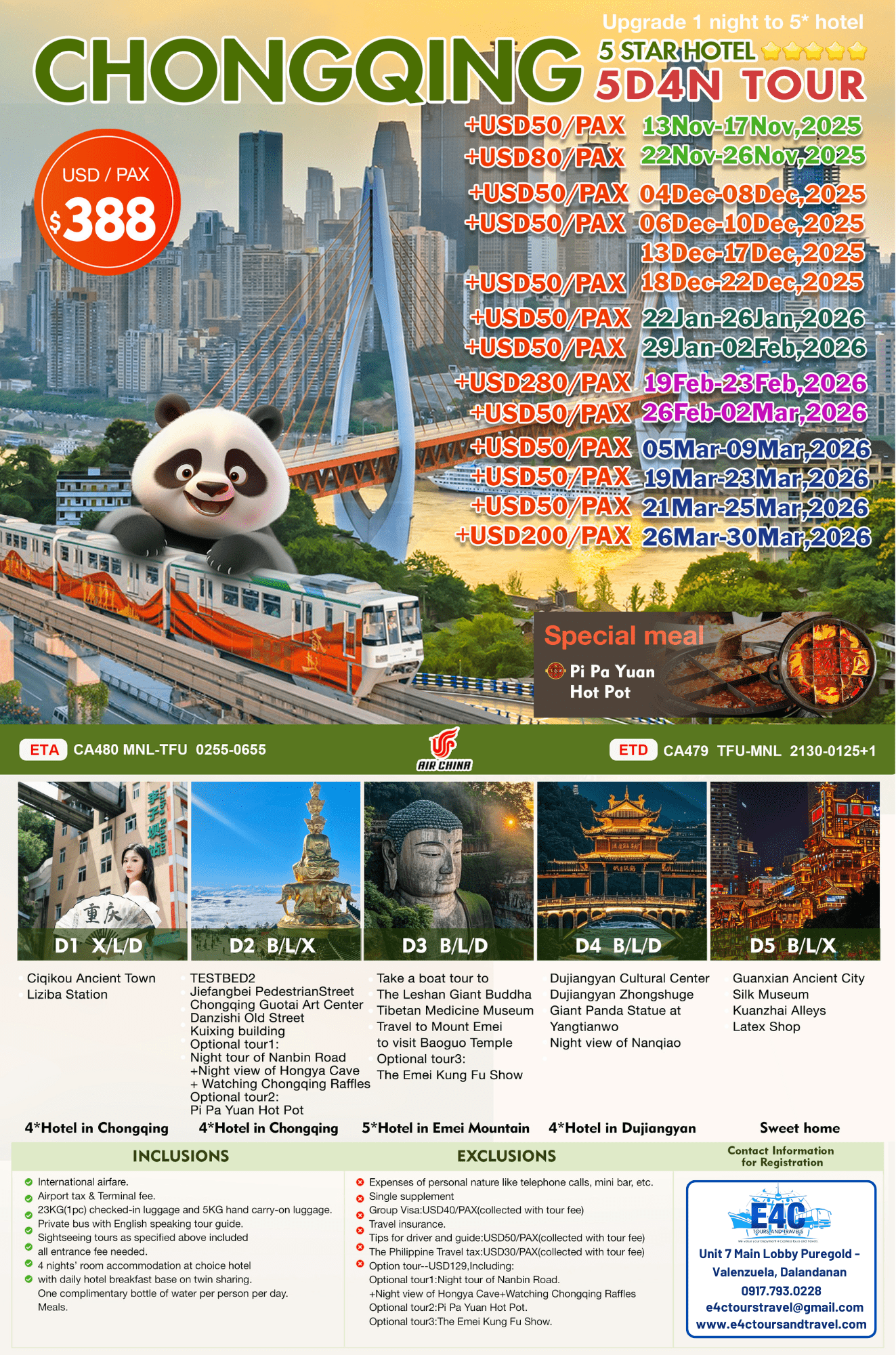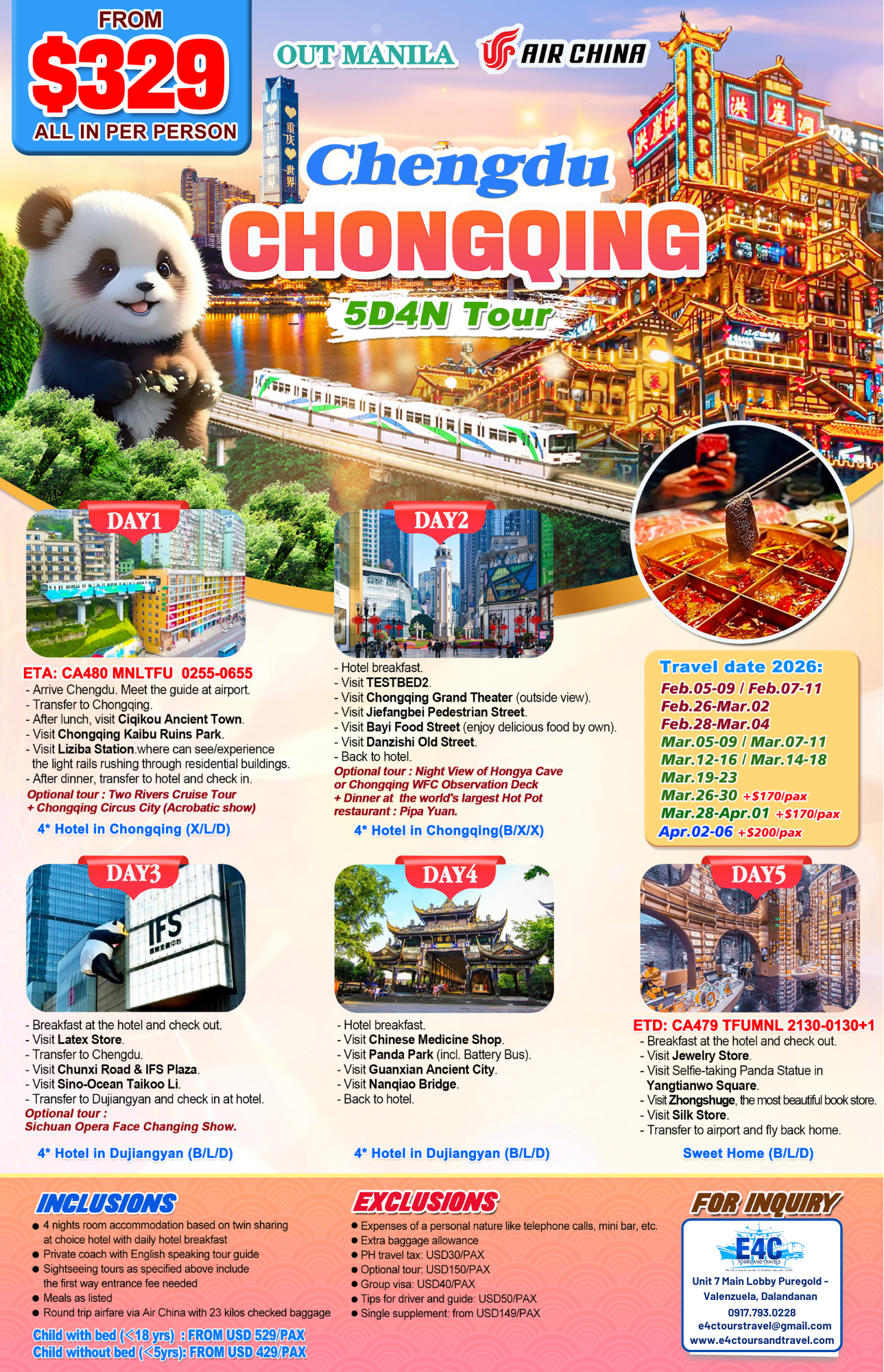 CHONGQING+CHENGDU 5D4N TOUR via CA, 2026