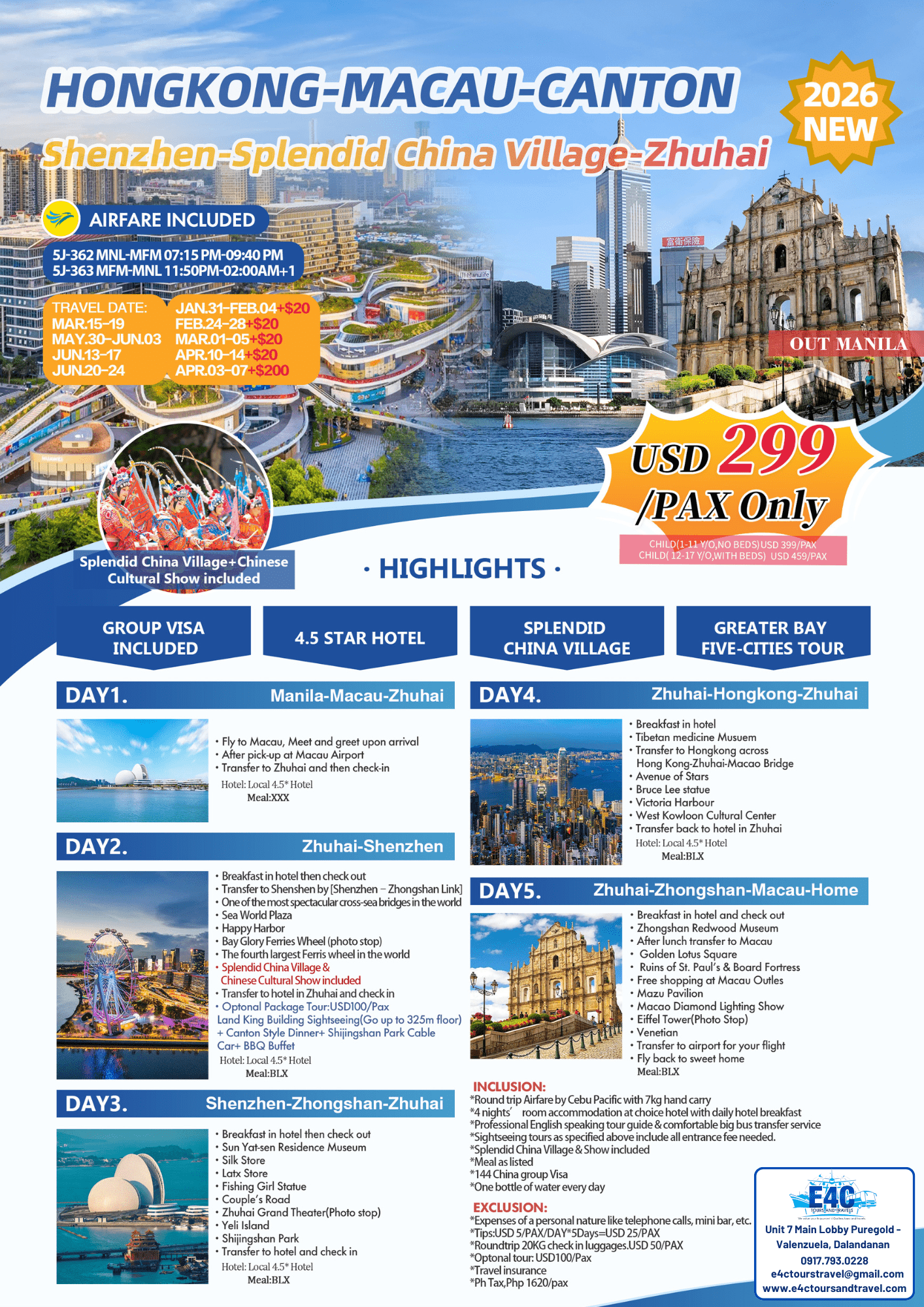 $ 299,2025 Hongkong-Macau-Zhuhai-Guangzhou 5D4N All in Package
